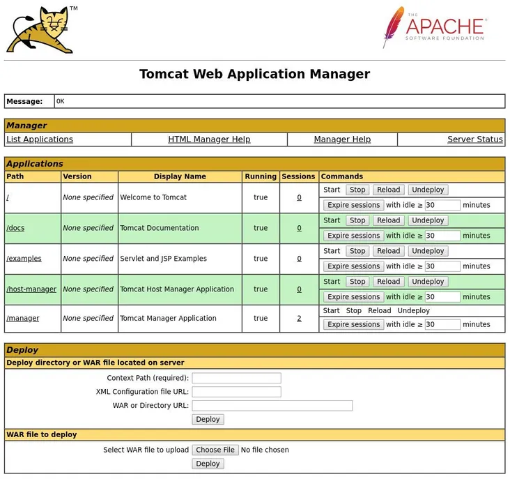 Tomcat 웹 응용 프로그램 관리자 대시보드는 http://<your_domain_or_IP_address>:8080/manager/html에서 사용할 수 있습니다. 여기서 애플리케이션을 배포, 배포 취소, 시작, 중지 및 다시 로드할 수 있습니다.