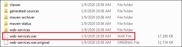 18단계: 경로를 복사하고 응용 프로그램의 대상 폴더에 액세스합니다. 우리는 우리가 pom.xml 파일에 지정한 이름과 같은 이름의 WAR 파일을 타겟 폴더 안에서 찾았습니다. 이 경우 경로는 다음과 같습니다.