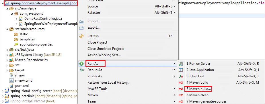 프로젝트 -> 다른 이름으로 실행 -> 5 메이븐 빌드를 마우스 오른쪽 버튼으로 클릭합니다.