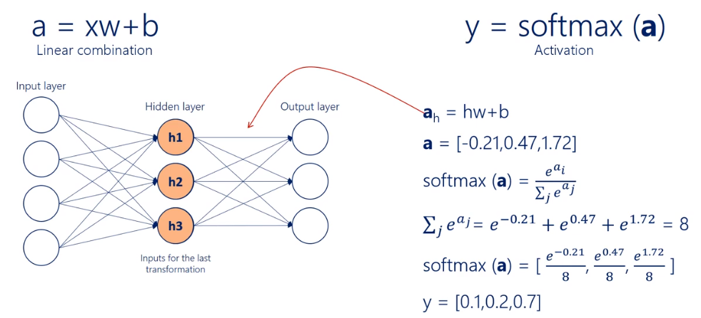 SoftMax는 가지고 있는 전체 수에 대한 정보를 고려하는 다른 요소들에 관계 없이 변환합니다. 예를 들어 보겠습니다. A는 잘 알려진 모델인 xw + B와 같습니다. 3의 유닛을 가진 숨겨진 레이어를 보겠습니다. 여기서 a는 선형 조합을 통해 변환한 후 hw + B와 같습니다. 0.2에서 1을 빼고 세 개의 유닛을 가진 벡터를 얻습니다.