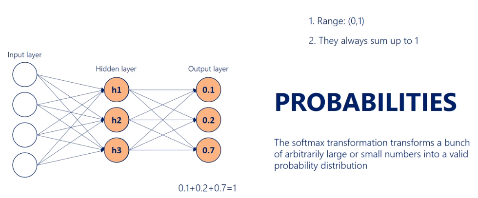 다른 속성이 있습니다. 바로 확률입니다. 실제로. 소프트맥스 변환의 요점은 임의로 크거나 작은 무리를 변형하는 것입니다. 이전 레이어에서 나온 숫자를 유효한 확률 분포입니다. 이것은 매우 중요하고 유용합니다.